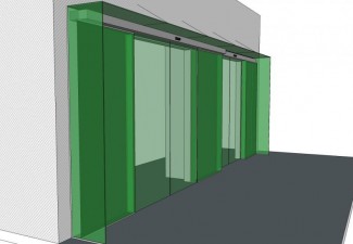Instalació en vidre llaminat amb vinil verd, el color corporatiu del client, composat per dos grans portes automàtiques, laterals i visera, tot amb vidre llaminat de seguretat vinilat.